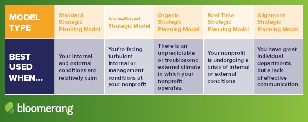 If you’re like many other small to mid-sized nonprofit organizations, you likely already changed direction from your original strategic plan whether you intended to or not. Bloomerang’s guide to strategic planning explains that there are different models of planning nonprofits should use depending on their external environment and internal affairs.